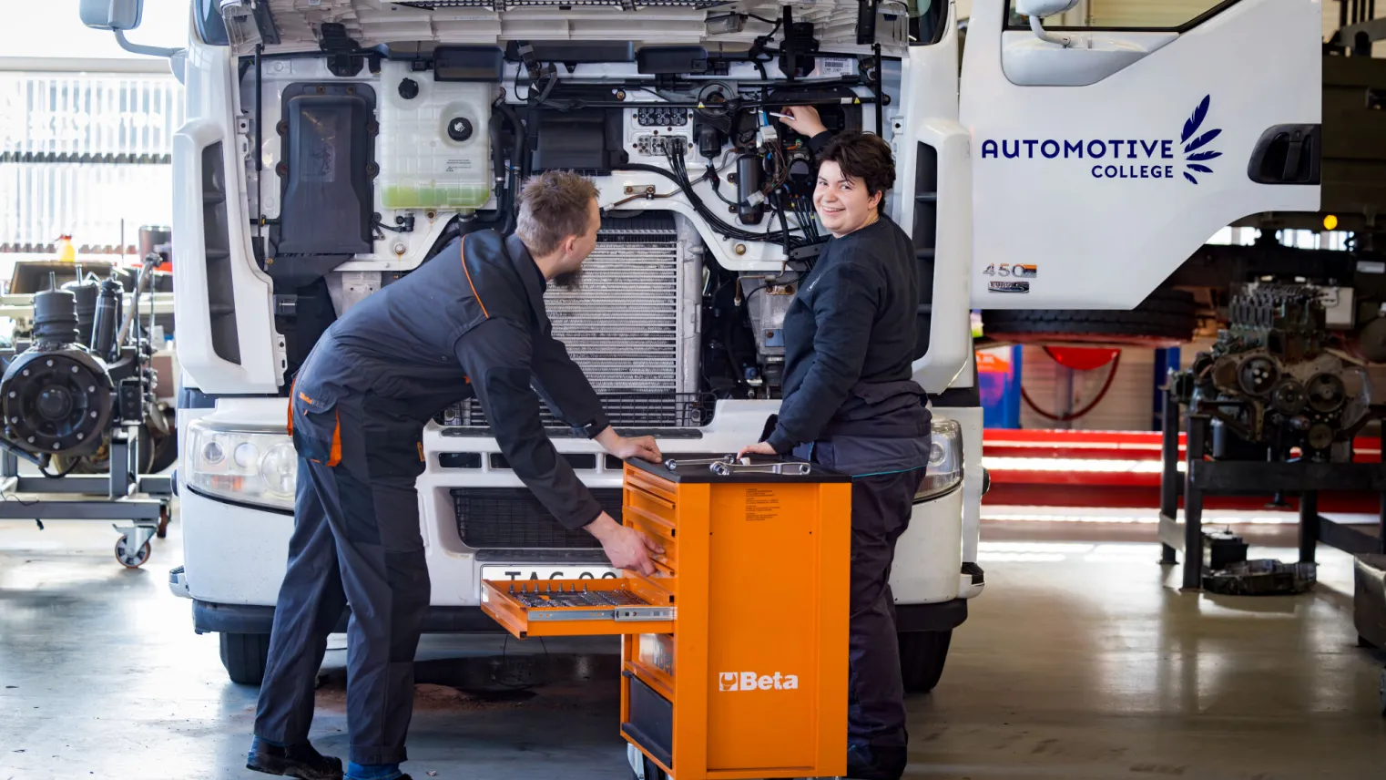 Studenten aan de opleiding Allround Bedrijfsautotechnicus werken bijvoorbeeld bij een truckdealer of een transportbedrijf.