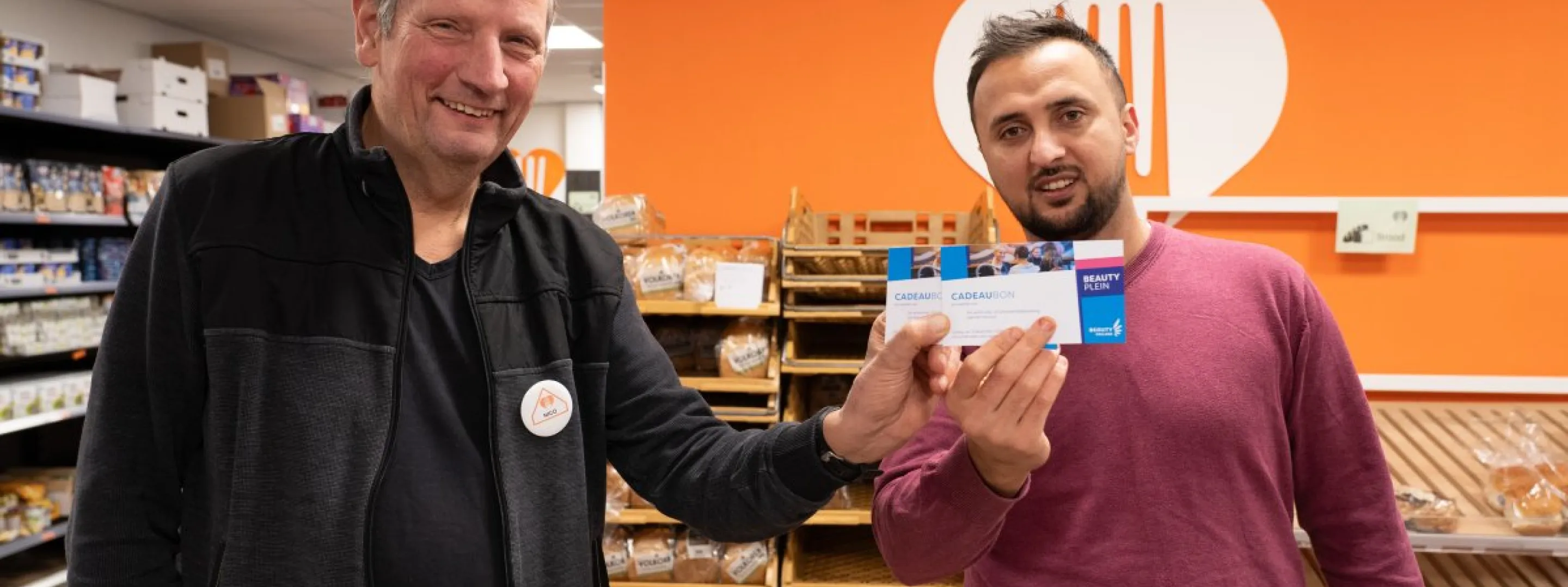 Fotobijschrift: Nico Jongerius van de voedselbank (links) krijgt de eerste cadeaubon overhandigd door Beauty College-student Wallat.