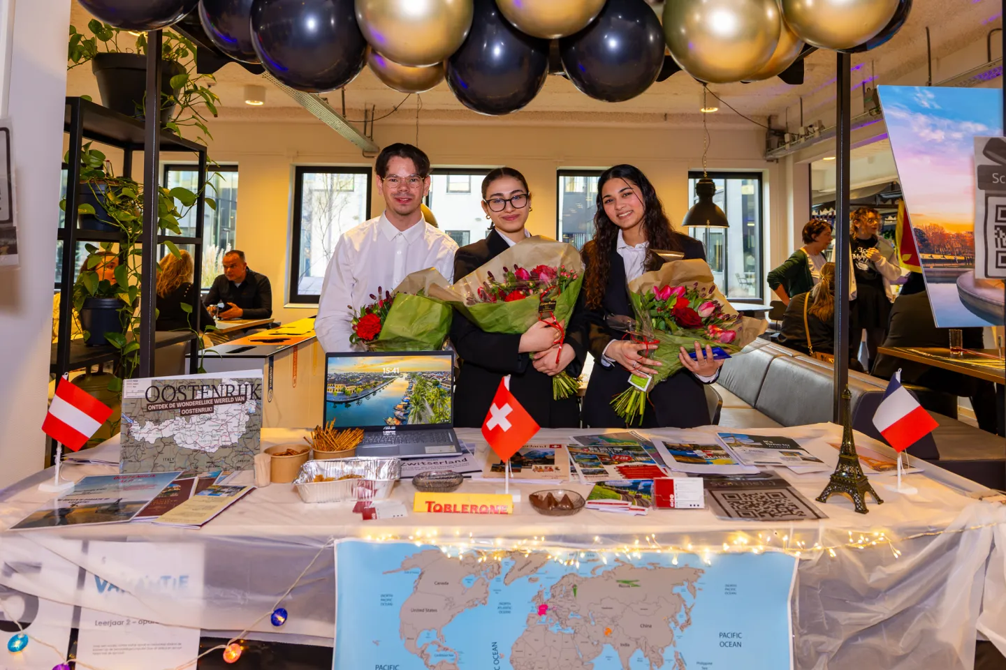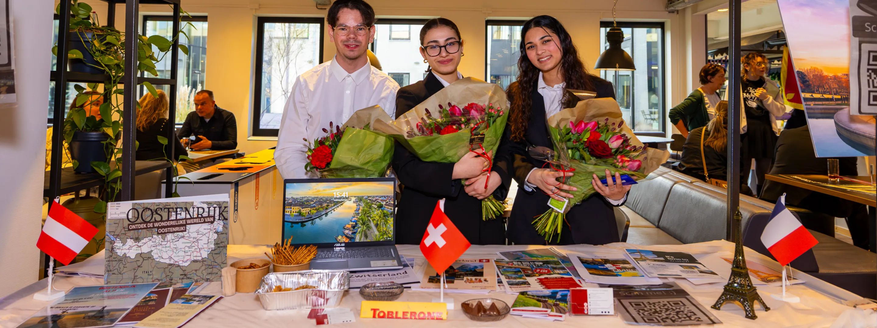 Het Horeca & Toerisme College stond woensdag 21 januari volledig in het teken van reizen, cultuur en gastvrijheid. Tijdens de jaarlijkse Vakantiebeurs, met dit jaar het thema ‘Grenzeloos Gastvrij’, werden bezoekers meegenomen op een inspirerende reis langs verschillende landen en culturen. De eerstejaars studenten van de opleiding Leidinggevende Toerisme & Recreatie presenteerden hun bestemmingen niet alleen met informatie, maar vooral met beleving. Bezoekers konden langs kleurrijke stands wandelen, lokale hapjes proeven en luisteren naar verhalen over cultuur, natuur en toeristische highlights.