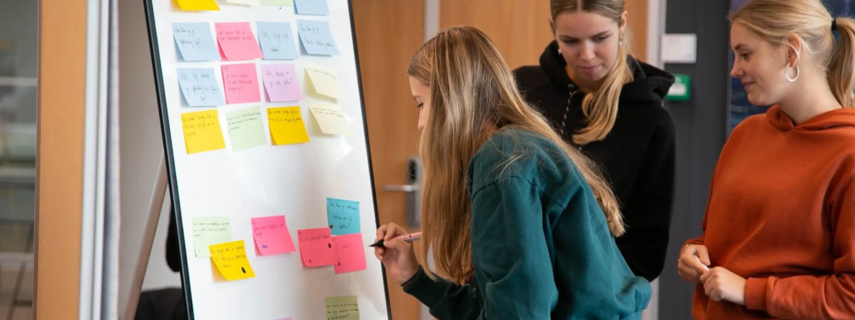 In oktober 2022 hebben 23 studenten tijdens verschillende brainstormsessies plannen voor een ‘Positieve Gezondheid-school’ gemaakt onder leiding van het creatieve bureau Ideate. ‘Ze hebben zoveel ideeën bedacht dat al onze post-its op zijn,’ lacht Jolien van der Meché van Ideate. ‘Ideeën waren onder meer ronde in plaats van rechthoekige tafels om contact te stimuleren, als je te laat bent tien keer opdrukken, een interne marktplaats om boeken uit te wisselen en stages te delen en een kast met spelletjes en sportspullen. Erg leuk en realistisch allemaal.’