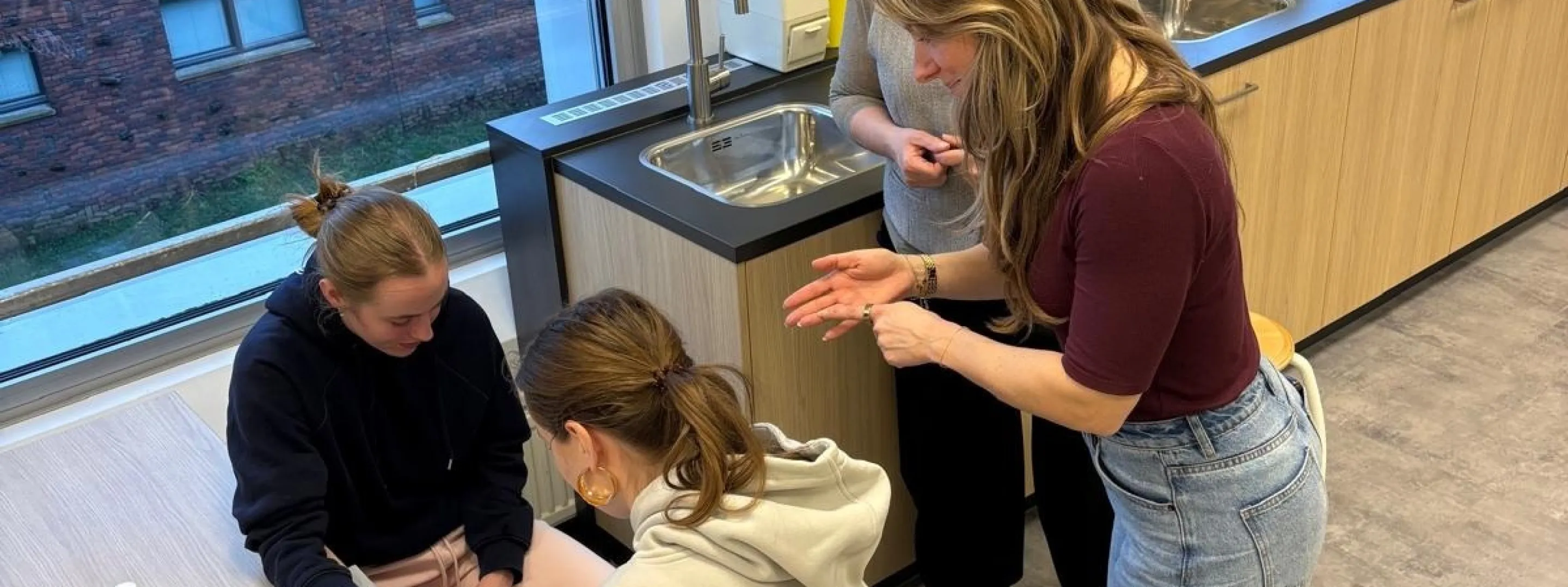 Een hoogtepunt? De praktijkles. “Ik ben zelf doktersassistent, dus ik laat ze zien hoe een glucose- of Hb-prik gaat. Dan zie je iedereen ‘aan’ gaan. Ze willen het liefst hun eigen mentor prikken,” lacht ze.